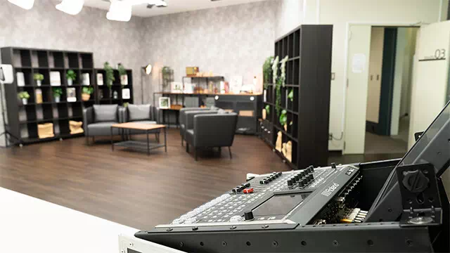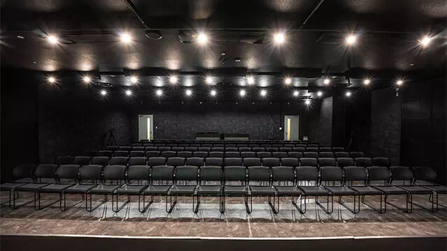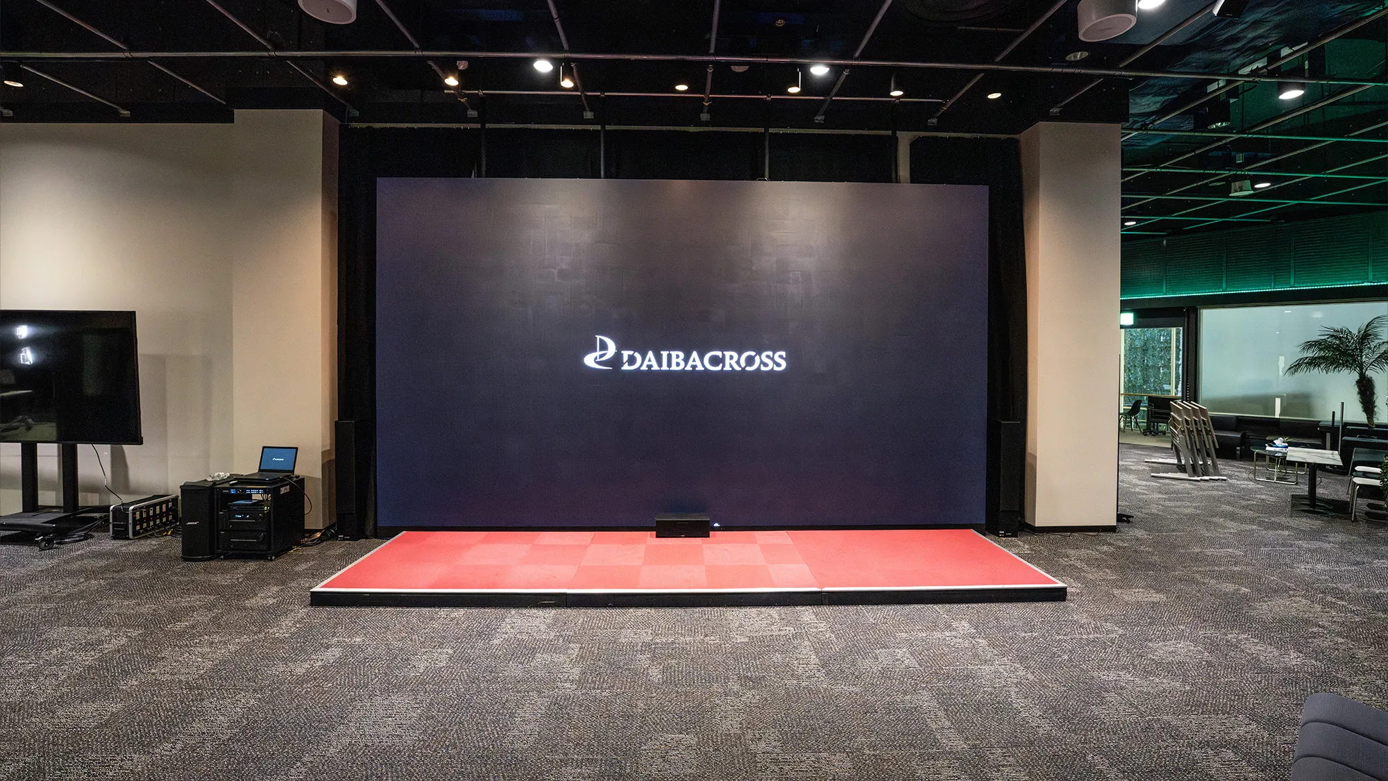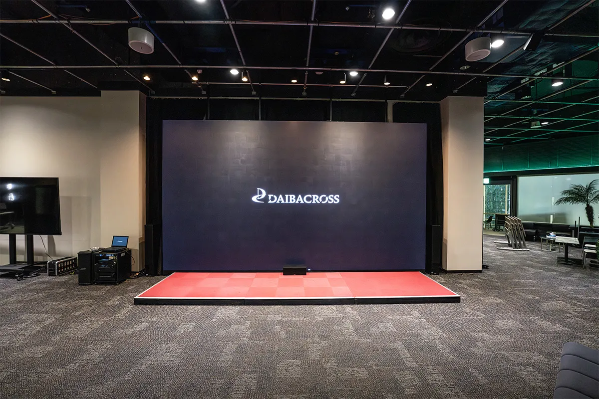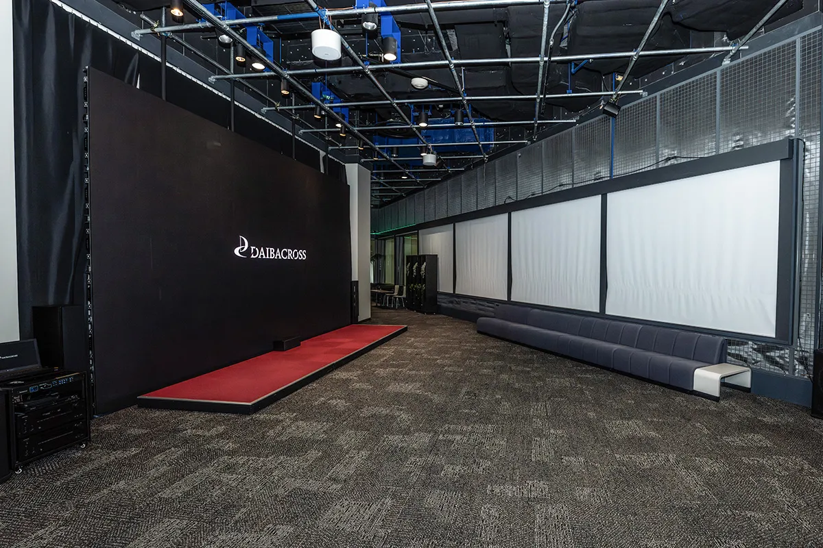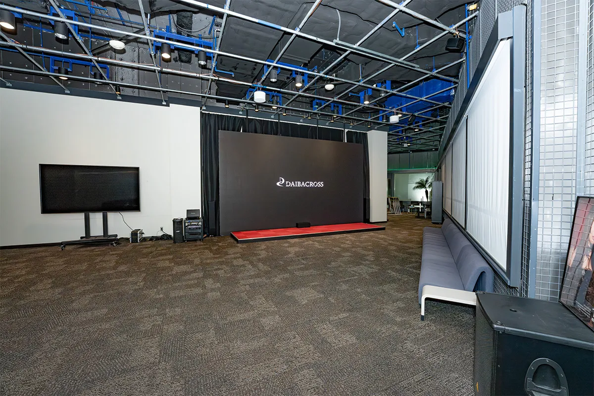 約 270 インチ(W6,000mm×H3,500mm) の大型 LED ディスプレイと高性能 AV システムを備えており、配信映像を映画館のような大画面でプレビュー可能。 赤いカーペット付きのステージもあり、製品紹介や技術デモ、インタビュー収録などに最適です。展示会風の演出や企業ブランディング映像の撮影にも対応し、スタジオとは異なる雰囲気で柔軟な映像制作が可能です。