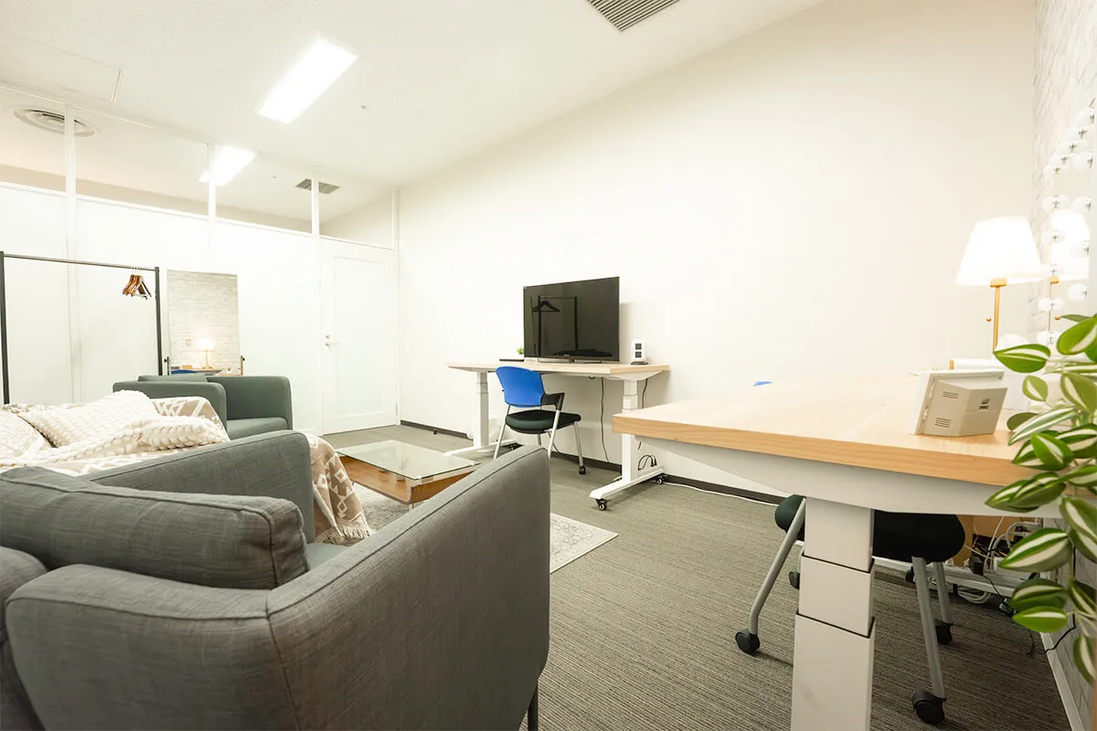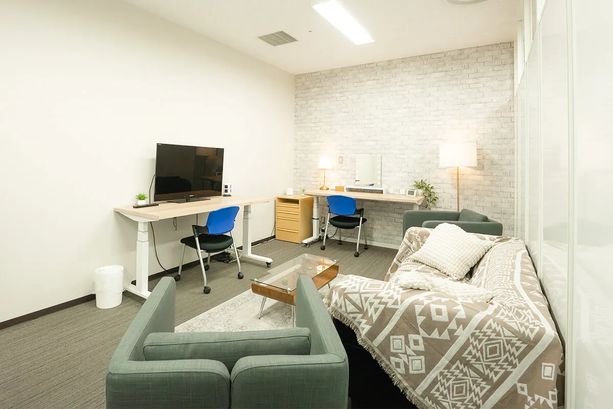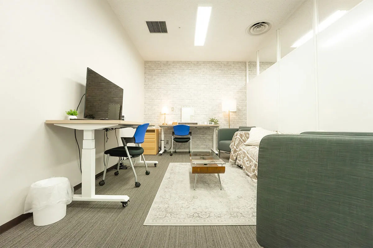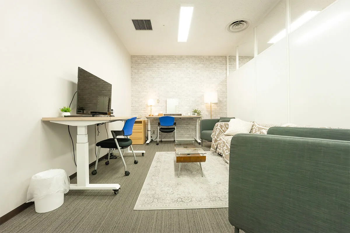 Aルームは、ソファとモニター、デスクを備えた落ち着いた空間で、打ち合わせや作業に最適。