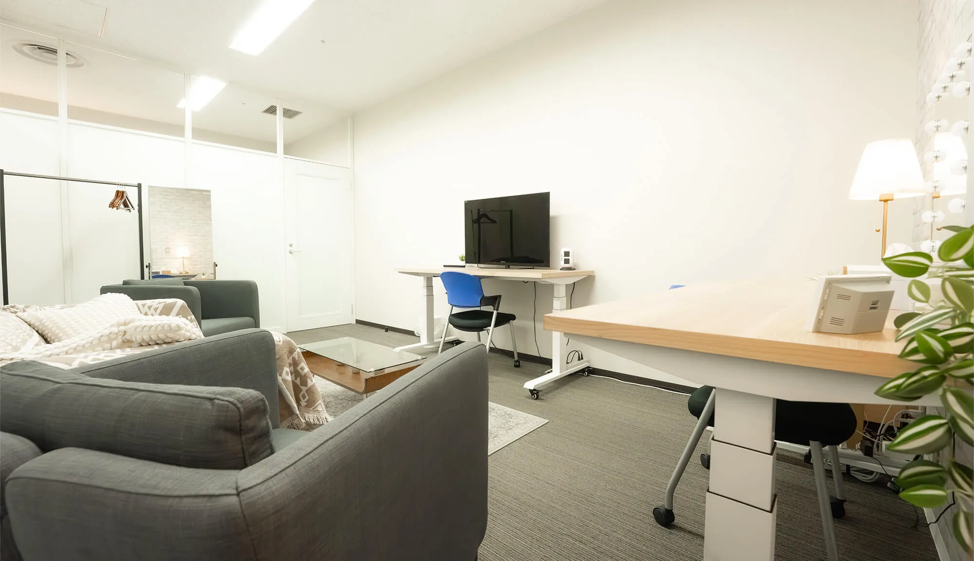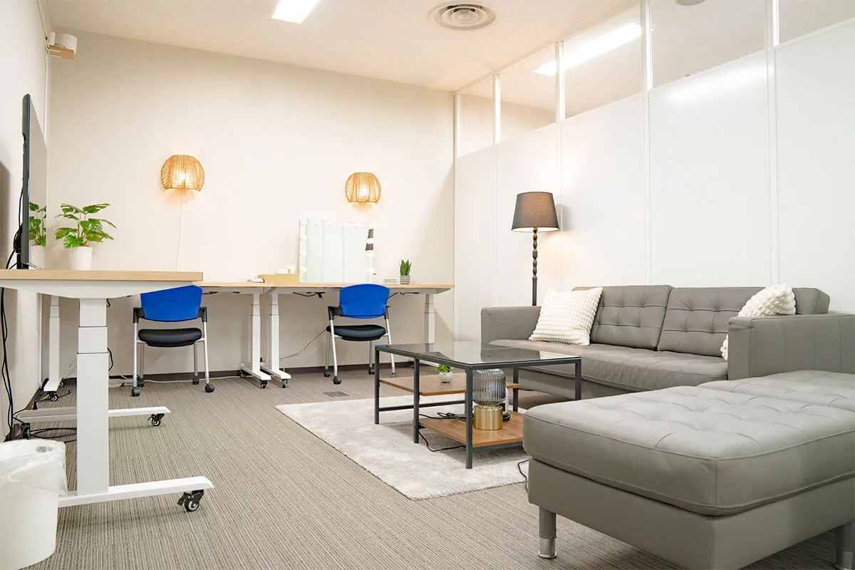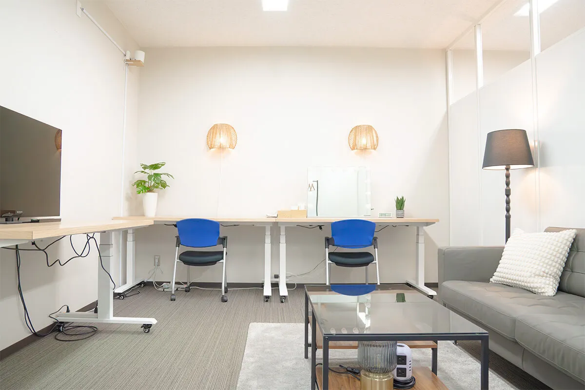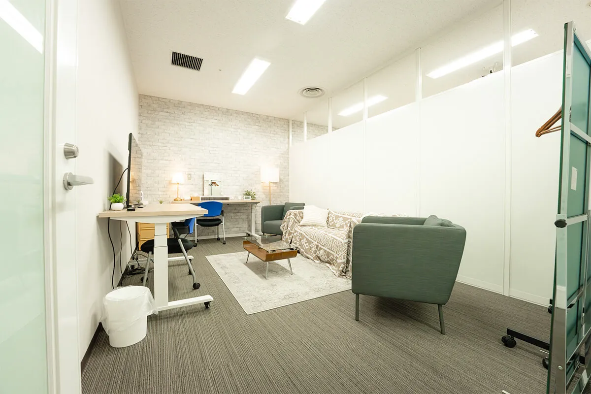 Aルームは、ソファとモニター、デスクを備えた落ち着いた空間で、打ち合わせや作業に最適。