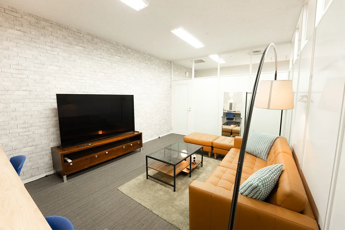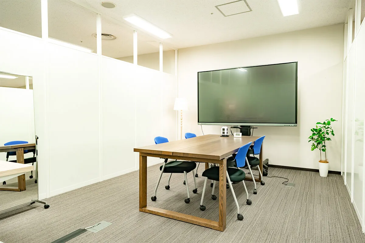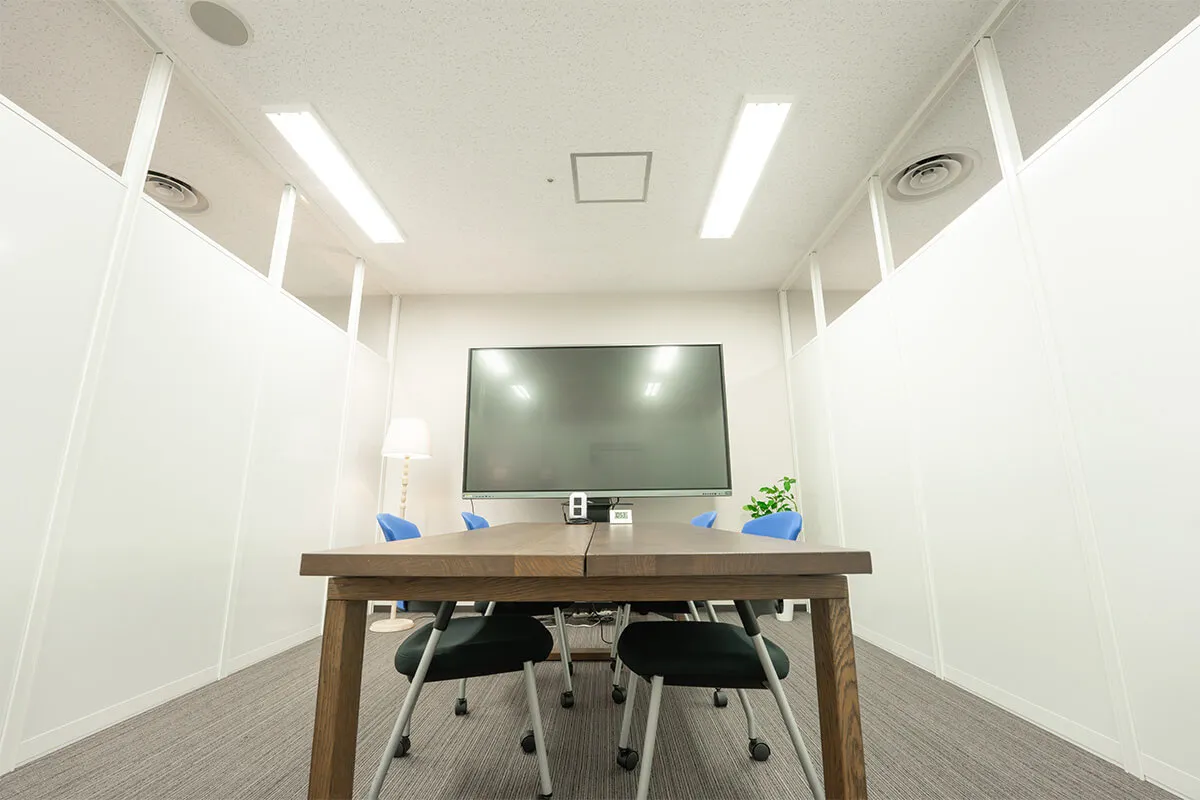 会議室タイプのBルームは、大型モニターと広いテーブルを備え、複数名での打ち合わせやリハーサルに便利です。