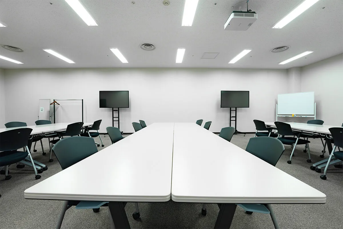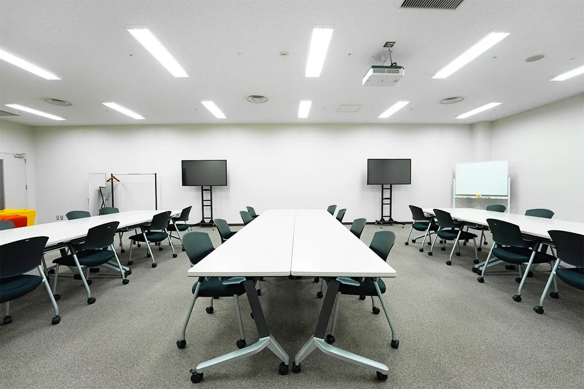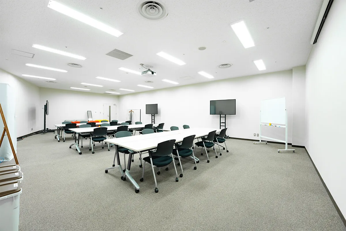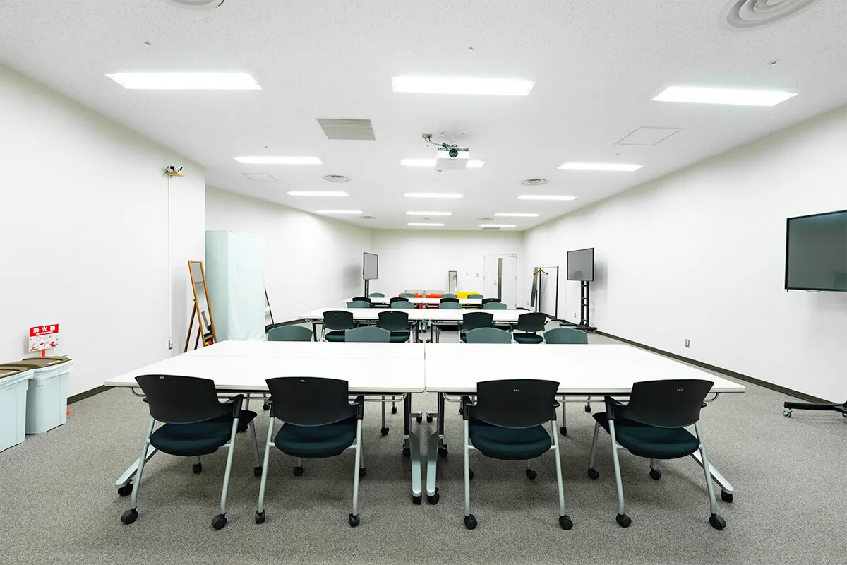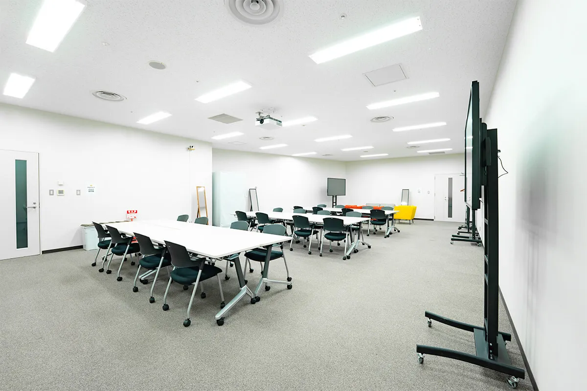 白壁とカーペット床、明るい照明により、清潔感のある落ち着いた空間を演出。 複数のテーブルと椅子が配置されており、対談やセミナー風の収録にも対応可能、教育系コンテンツや企業向けの動画制作にも適しています。 控室としての機能性と撮影空間としての柔軟性を兼ね備えた、実用的なエリアです。
